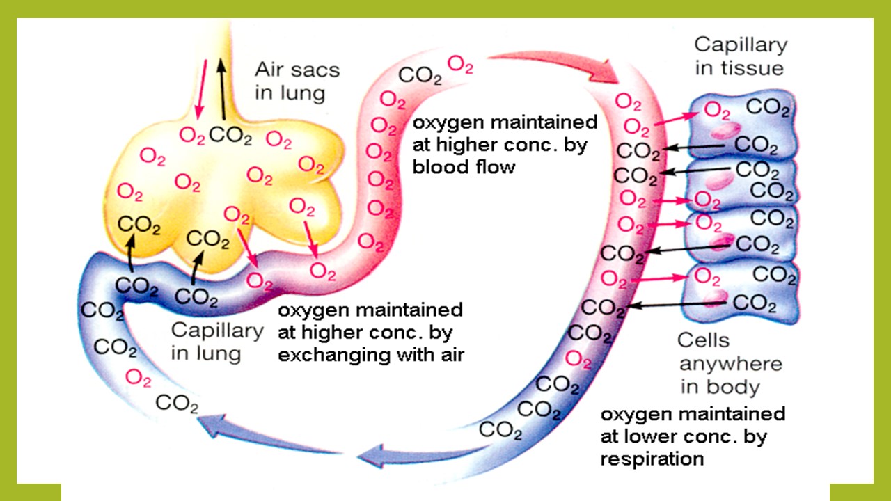 Oxygen moves from high concentration (in the air sac) to a lower concentration (in the blood). Carbon dioxide moves from high concentration (in the blood) to a lower concentration (in the air sac).